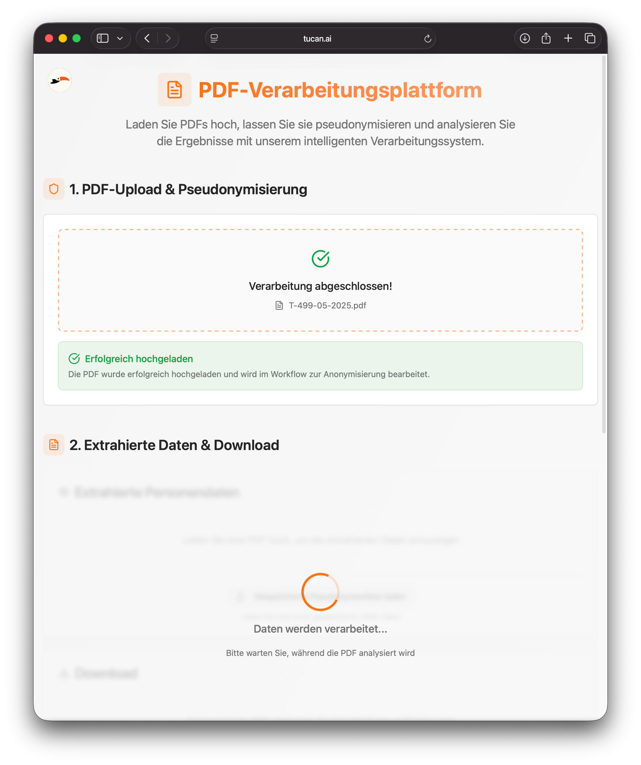 Der KI-Pseudonymisierer a bird by tucan entfernt automatisch alle personenbezogenen Daten aus Ihren PDF-Dateien. Das Ergebnis ist eine pseudonymisierte Version, die Sie bedenkenlos mit Chatbots wie ChatGPT teilen können – inklusive späterer De-Pseudonymisierung.